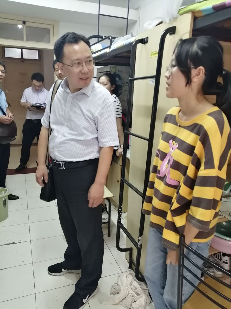 田院长一行先后走进5栋男生寝室和7栋女生寝室。在学生寝室里,田院长亲切的拉着同学的手并且逐一询问寝室里的新生对寝室生活是否习惯,以及对即将到来的军训有哪些期待。田院长对少数民族同学的生活也表现出热切的关心,并且询问了他们是什么民族,在学校的饮食是否习惯。