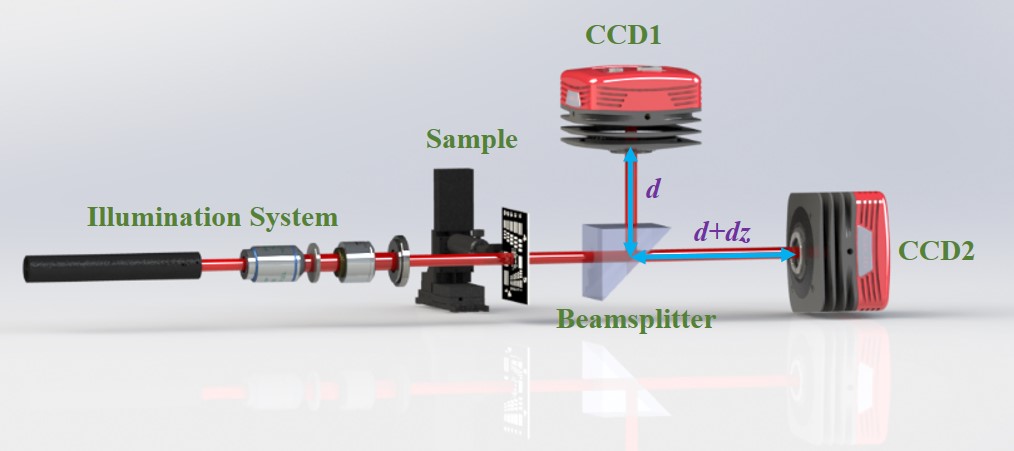 近期,15VIP太阳集团应用物理系窦健泰老师提出了一种轴向多平面光场校正的快速收敛叠层成像方法(MAIC-PIE),该方法将在待测物后方放置分光棱镜进行轴向分光,并在每束光束不同的轴向位置处放置相同型号的CCD。当光场传输到CCD1时由采集的光强校正后再传输到CCD2,然后再一次由CCD2采集的光强校正,即可提高收敛速度。相关论文发表在光学TOP期刊Optics Express, 2020, 28(3), 3587-3597。