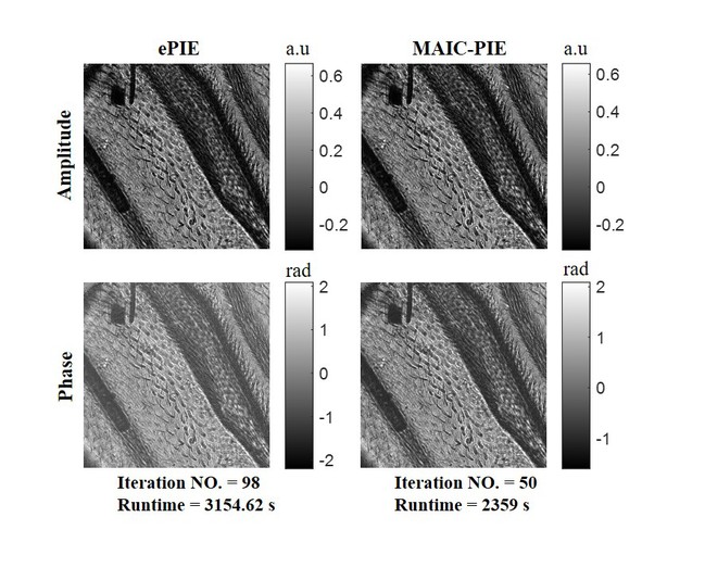 为进一步提高收敛速度,研究团队将分光棱镜放置在物体和CCD之间用于轴向分离与物体作用后的衍射光束,在分离的轴向光束中分别放置相同型号的CCD,且每个CCD到分光棱镜的轴向距离不同。多个CCD同时工作可获得轴向多个平面处的光强图像,将采集到的多个轴向光强图像用于校正CCD平面处的光场。为防止迭代收敛于局部最优解,在校正CCD平面处光场时,引入松弛因子α(0<α<1),使本次校正的光场与原光场按1-α: α的比例混合后形成新的光场,并将新的光场代入后续处理过程。轴向多平面光强限制方法在CCD平面处进行多次光场校正,可在最初几次迭代建立合理的照明光场和物函数,并将其代入后续迭代,即可得到精确的照明光场和物函数,进而提高收敛速度。