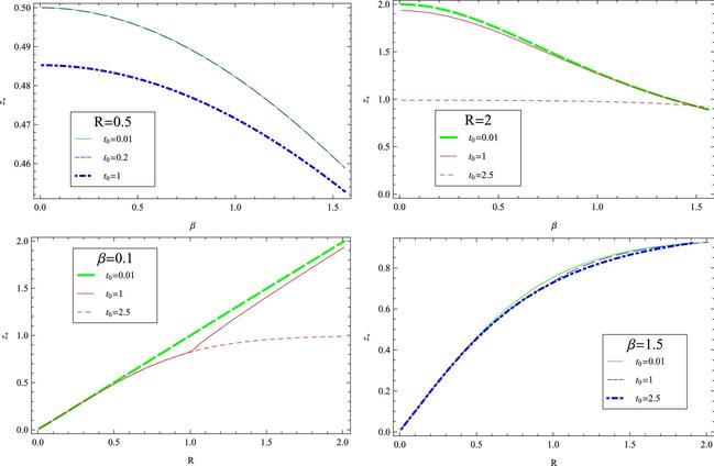图1:(上)相同圆半径(R=0.5,2)下超曲面顶点z*和耦合常数在不同时间点的关系。(下)相同耦合常数下圆半径和超曲面顶点在不同时间点的关系。其中红色实线弯折点代表了球壳所在位置。