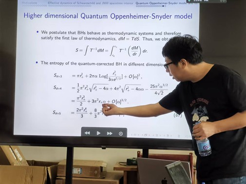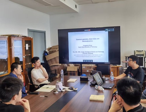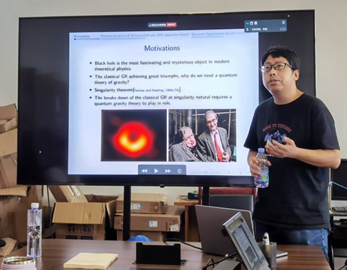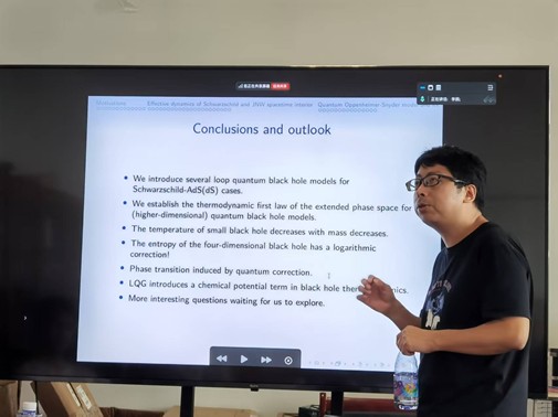 张教授报告的会议题目是“量子几何,黑洞和热力学”。张教授通过层次分明和条理清晰的讲解,引导听众逐步理解其如何将微观的量子理论与宏观的黑洞模型结合起来,展示了其在圈量子引力领域的深入研究与思考。