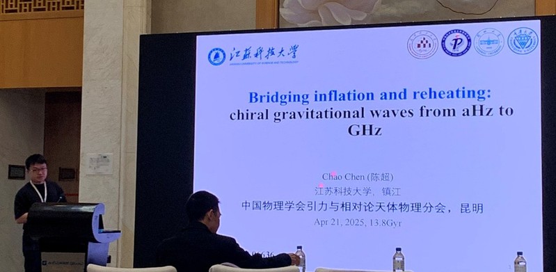 陈超老师则带来了题为《Bridging inflation and reheating: chiral gravitational waves from aHz to GHz》的报告。陈老师致力于分析早期宇宙中手性引力波信号,建立暴胀阶段与再加热过程之间的联系,不仅揭示了手性引力波的产生机制,更为宇宙起源模型的检验提供了新的理论视野。