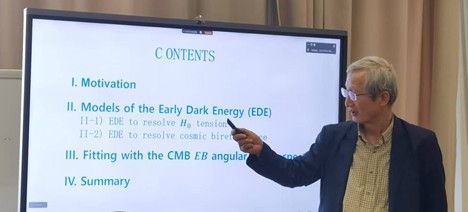6月10日,Lee教授继续带来题为《Early Dark Energy Models and Cosmological Tensions》的第二场报告。在首日报告基础上,他将视角拓展至当前宇宙学研究的前沿问题——哈勃常数危机与宇宙双折射现象。他指出这两大观测难题对宇宙学标准模型构成严峻挑战,并提出其早期暗能量模型可作为可能的解决方案,更展示了基于10维参数空间的数据拟合结果,阐述该模型在缓解哈勃常数危机与宇宙双折射问题方面具有“一箭双雕”的潜力。他进一步系统分析各参数在模型中的敏感度和作用强度,打破了“早期暗能量无法解释宇宙双折射”的传统观点,强调了参数优化在宇宙学理论发展中的关键作用。
