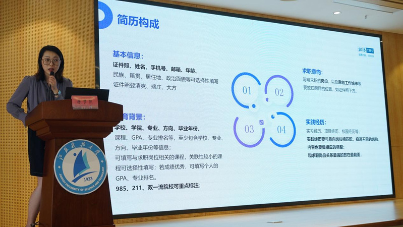 动员会后,扬州杨杰电子科技股份有限公司人力资源部主管张小凤、南京拓尔思智能系统有限公司华东区运营总监蒋梦然、镇江市新东方教育培训有限公司主管王凡等为毕业生带来校园招聘宣讲,并为全体毕业生做职业规划和求职就业的专题培训。