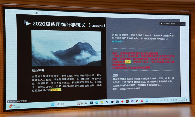 2024届应用统计专业校友、江苏银行镇江分行史大军结合自身求职经历,围绕网申材料准备、笔试和面试重点及注意事项等详细讲解了面向银行的求职经验。他号召大家主动抓住机遇,大胆尝试与自我推荐,在实践中收获成长。