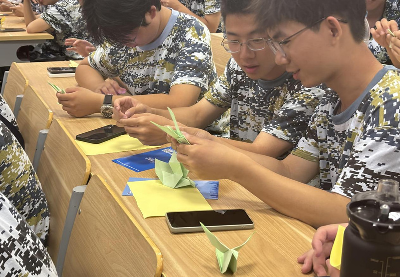 本次活动分为三个主要环节:“折和平鸽•寄和平心愿”“观纪录片•忆峥嵘岁月”和“知识问答•强历史认知”。同学们在工作人员的指导下折叠和平鸽并书写和平寄语,共同观看反法西斯战争纪录片,并通过知识竞答深化对历史的理解。活动还设置了线上视频征集环节,鼓励学生复刻爱国电影经典场面。